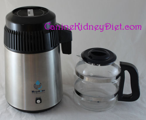 I heard somewhere that distilled water is easier on the kidneys. I don't know if this is true, but it kind of makes sense. As Roxie's kidney disease progressed, I started using distilled water for all her water needs. This includes not only her drinking water, but water used to cook foods for her such as pasta & rice. I got tired of lugging home gallons of distilled water or trying to find a place to store them all, when I'd stock up if it was on sale. So I invested in a countertop distiller. I also started using home distilled water for our coffee, so that I could cancel the delivery of spring water & help defray the cost of the distiller. At this point, the countertop distiller has now paid for itself.