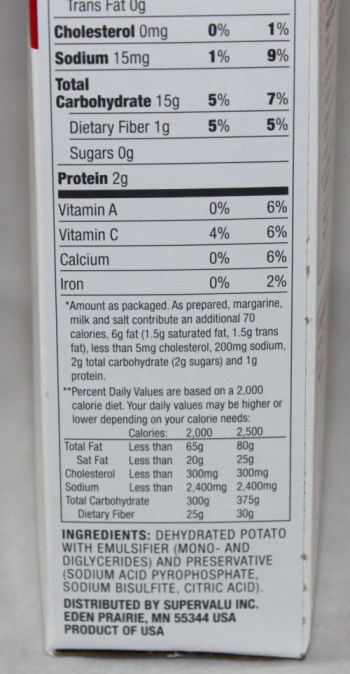 Ingredient list of Essential Every Day brand of instant mashed potatoes